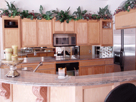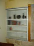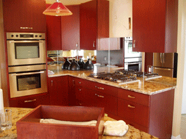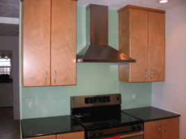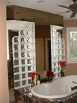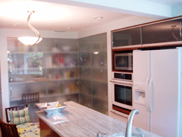 Sandblasted Glass Backsplash Allows Wall Color to Show Through